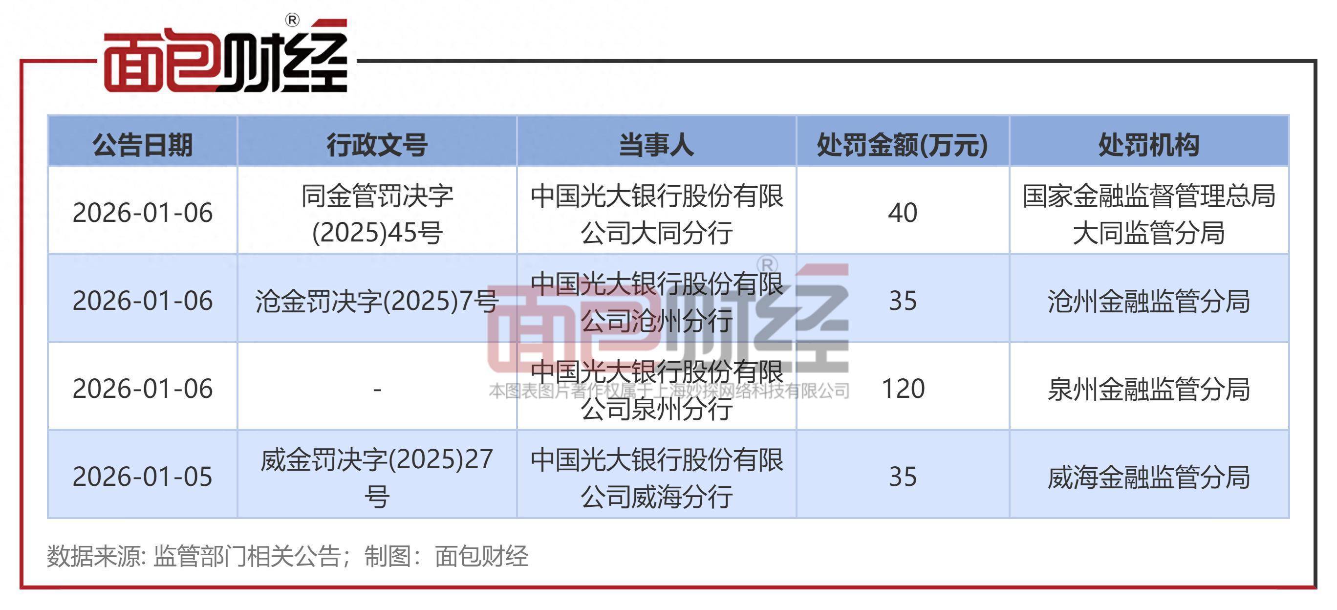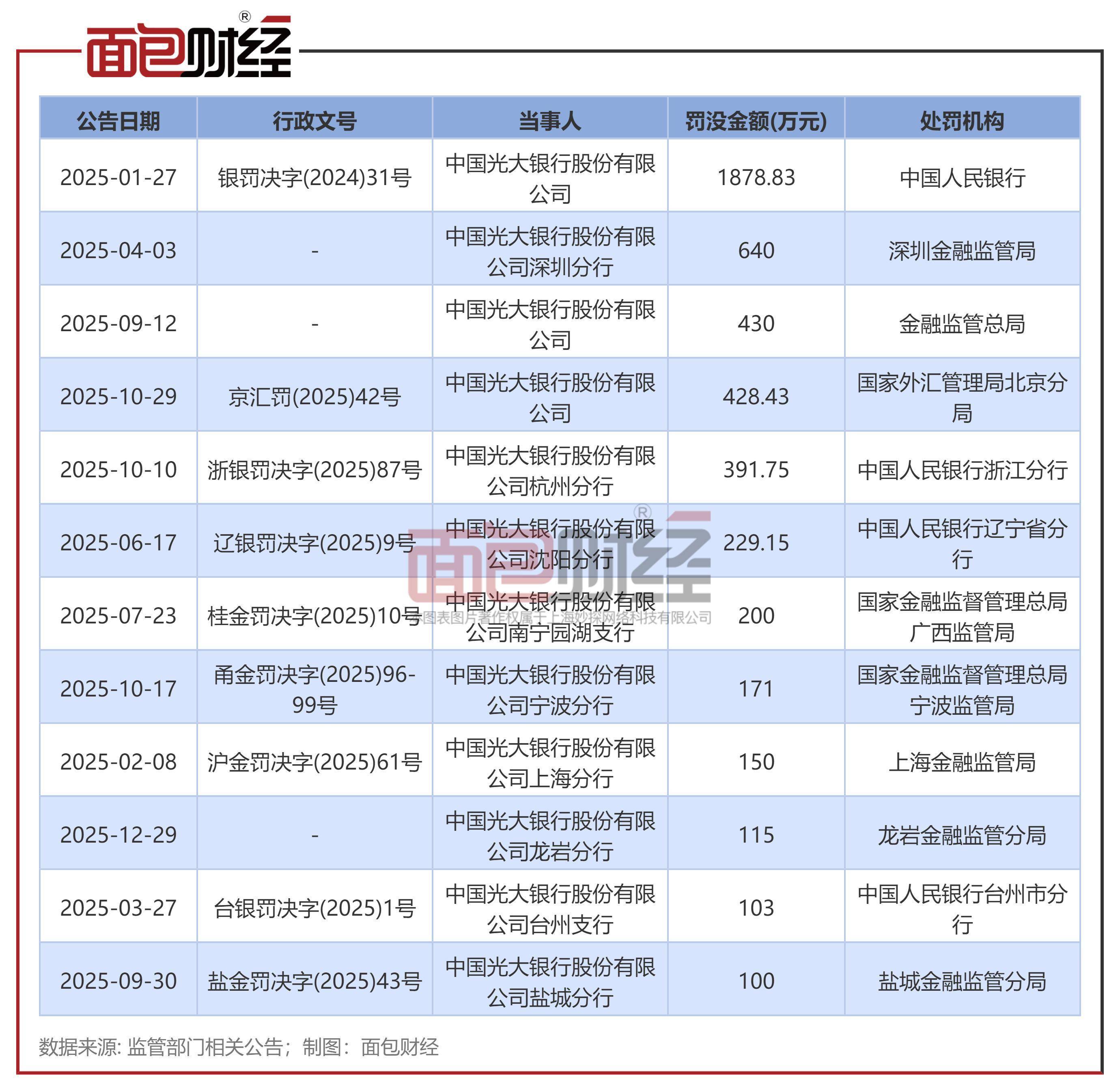 因信贷相关业务违规连收多张罚单2026年1月6日,光大银行因信贷相关业务违规连收三张罚单,累计罚款195万元,多名相关负责人被警告。
